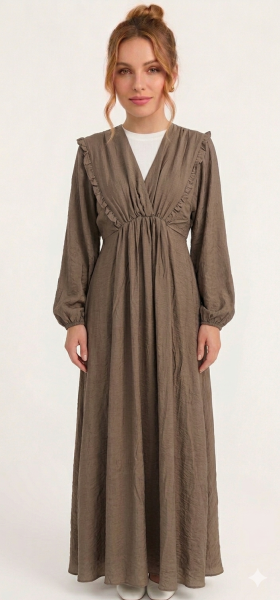فستان "ماكسي" (طويل) بتصميم ريفي ناعم (Boho-chic)، يتميز بالبساطة والأناقة التي تعتمد على تفاصيل القصة والقماش