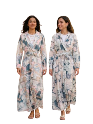 فستان (دريس) مشجر طويل للمحجبات، يتميز بتصميم عصري وأنيق مستوحى من طابع "الروب" أو "البشت" مع طبعات فنية متداخلة